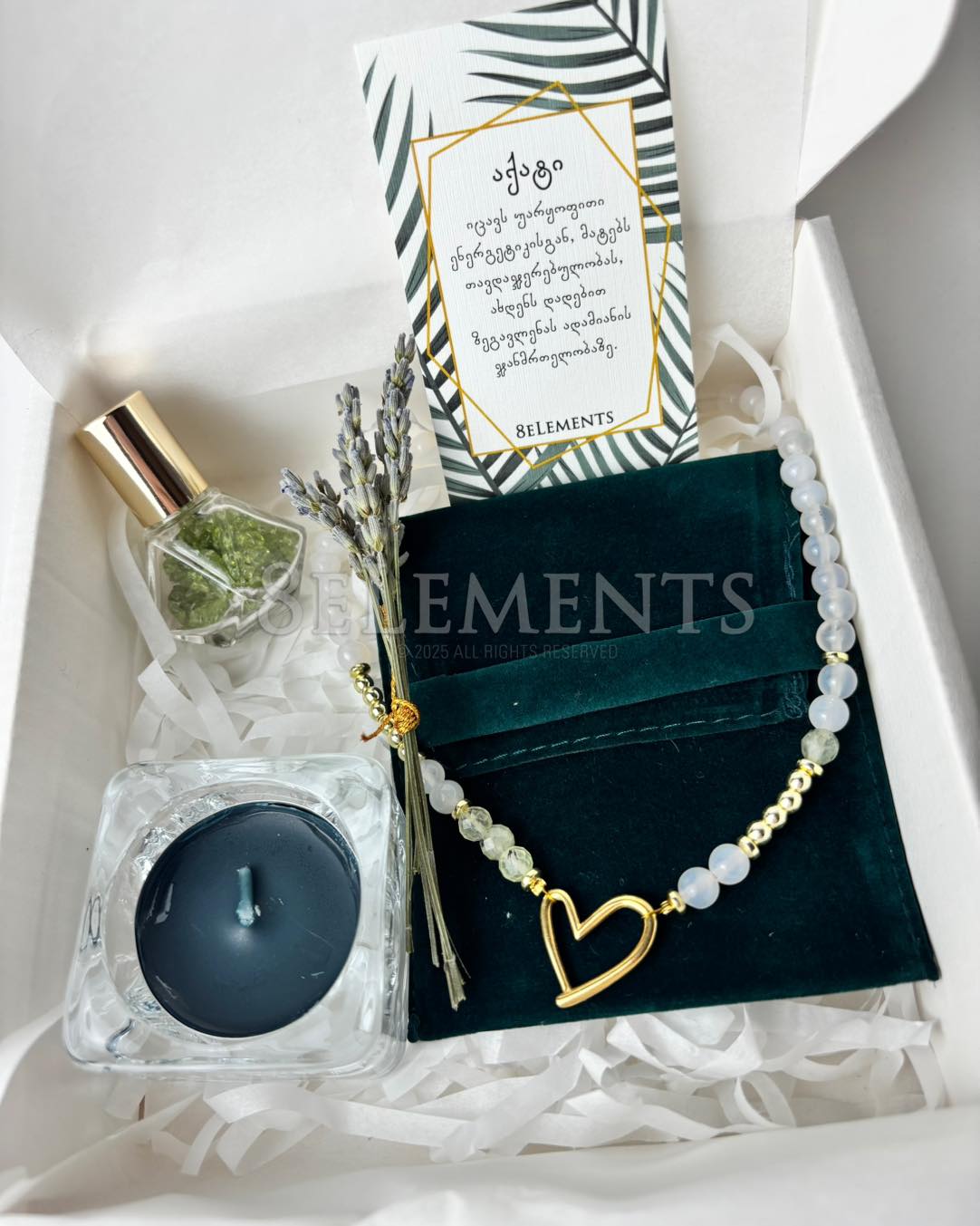 რაოდენობა: სასაჩუქრე კომპლექტი,პრენიტი, თეთრი აქატი, ქრიზოლიტი